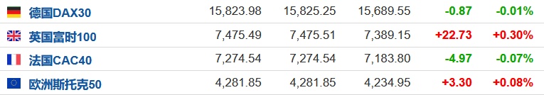 2.截至发稿,德国DAX指数跌0.01%,英国富时100指数涨0.30%,法国CAC40指数跌0.07%,欧洲斯托克50指数涨0.08%。