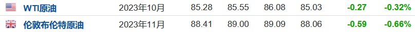 3. 截至发稿,WTI原油跌0.32%,报85.28美元/桶。布伦特原油跌0.66%,报88.41美元/桶。