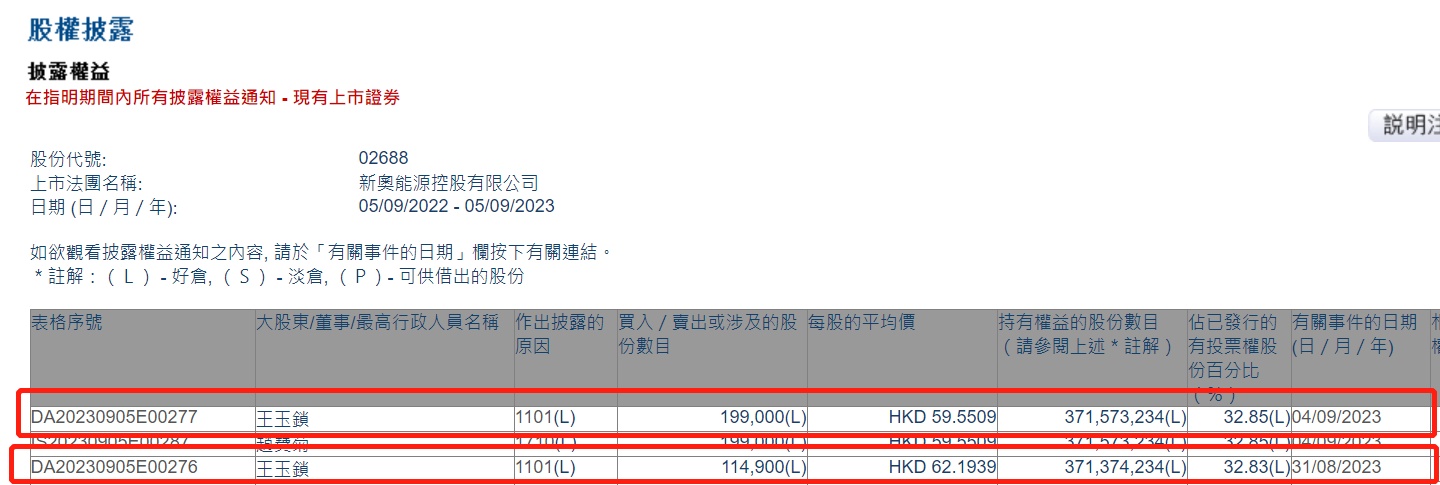 智通财经APP获悉,香港联交所最新资料显示,8月31日、9月4日,董事局主席王玉锁分别增持新奥能源(02688)11.49万股、19.9万股,合计31.39万股;每股作价分别为62.1939港元、59.5509港元;总金额约为1899.67万港元。增持后最新持股数目约为3.72亿股,最新持股比例为32.85%。