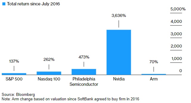 现在若将其与自该交易宣布以来其他股指的表现进行比较会发现,标普500指数的涨幅大约是这个数字的两倍,而费城半导体指数则飙升了五倍,该指数涵盖了许多向Arm支付专利使用费的公司。此外,还有Arm最大的客户之一英伟达(NVDA.US),该公司同期回报率超过3600%。
