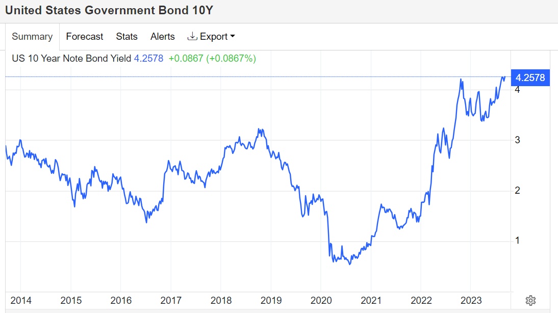 有着“老债王”之称的比尔·格罗斯(Bill Gross)近日表示,美国债务被市场“高估”了,格罗斯预计,10年期美国国债收益率的公允价值约为4.5%,这预示着“全球资产定价之锚”可能还有上行空间。截至发稿,10年期美国国债收益率位于4.25%这一历史高位附近波动。