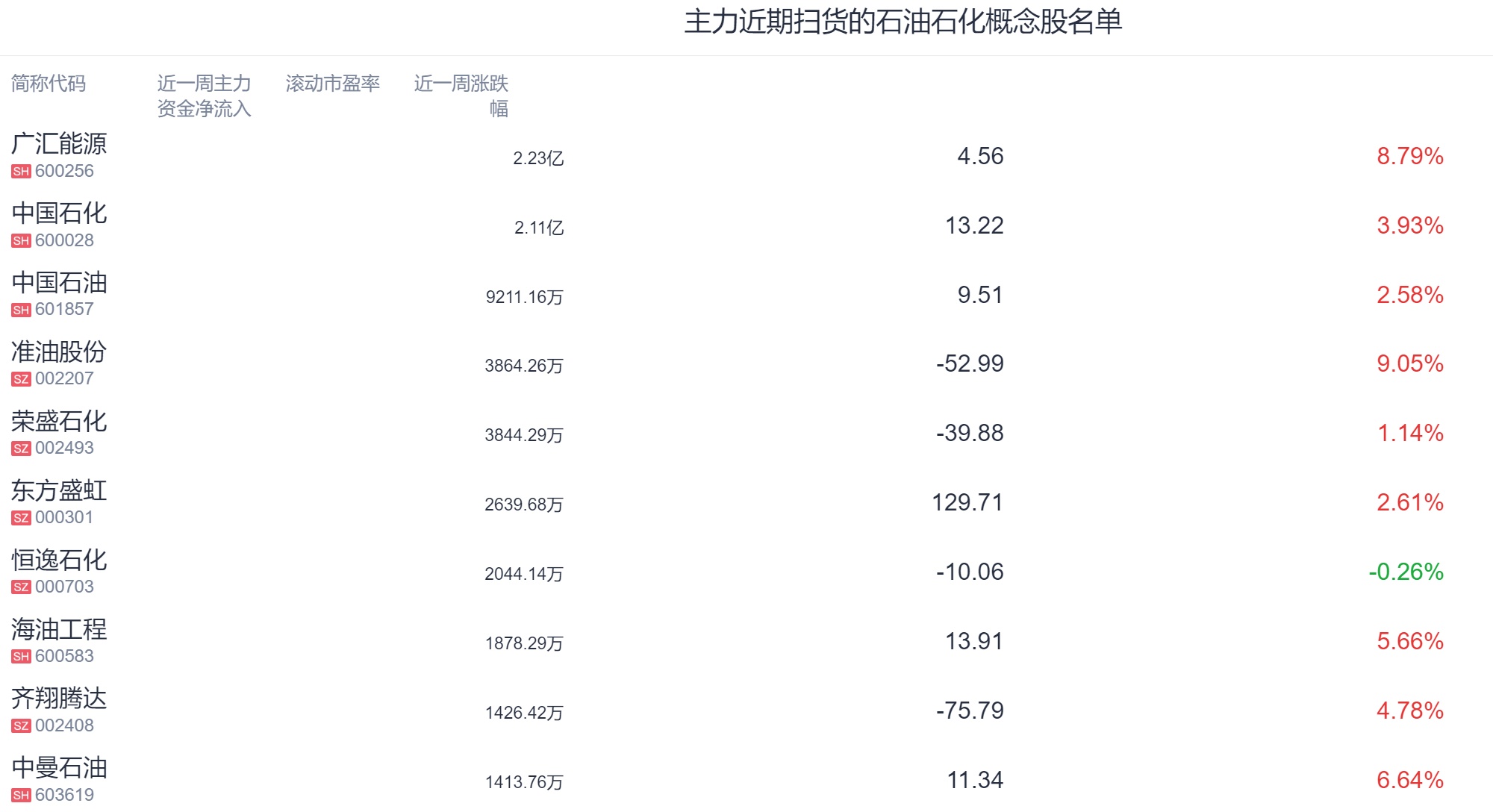 腾讯自选股为您梳理了,最近一周主力资金净流入前十的石油石化概念股名单,供您参考。数据显示,主力扫货2股超亿元,其中,广汇能源、中国石化近一周获主力资金净流入均超2亿元。