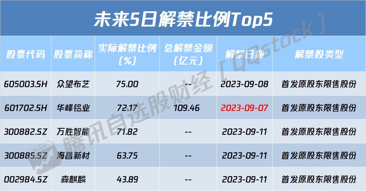 从解禁比例来看,未来5日众望布艺解禁比例达75%,其次解禁比例居前的分别为华峰铝业、万胜智能。