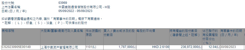 智通财经APP获悉,香港联交所最新资料显示,8月30日,上海宁泉资产管理有限公司增持中国通号(03969)178.7万股,每股作价2.61港元,总金额约为466.407万港元。增持后最新持股数目约为2.37亿股,最新持股比例为12.04%。