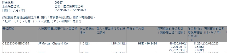 智通财经APP获悉,香港联交所最新资料显示,8月30日,小摩增持百胜中国(09987)115.4343万股,每股作价416.3486港元,总金额约为4.81亿港元。增持后最新持股数目约为4663.06万股,最新持股比例为11.22%。