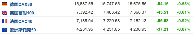 2.截至发稿,德国DAX指数跌0.53%,英国富时100指数跌0.61%,法国CAC40指数跌0.92%,欧洲斯托克50指数跌0.87%。