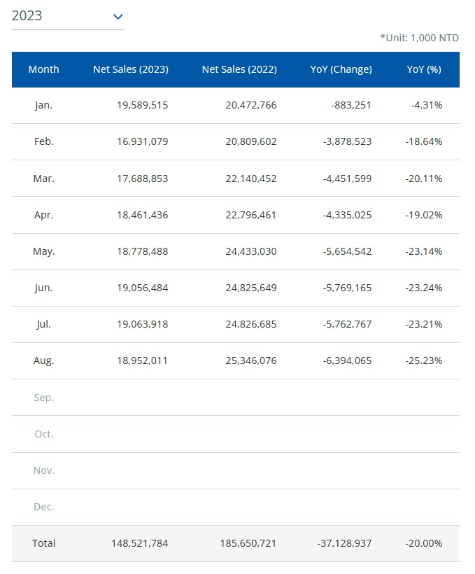 智通财经APP获悉,联电(UMC.US)8月净销售额同比下降25.23%,至189.52亿元新台币;在1月至8月期间,该公司净销售额同比下降20.00%,至1485.22亿元新台币。