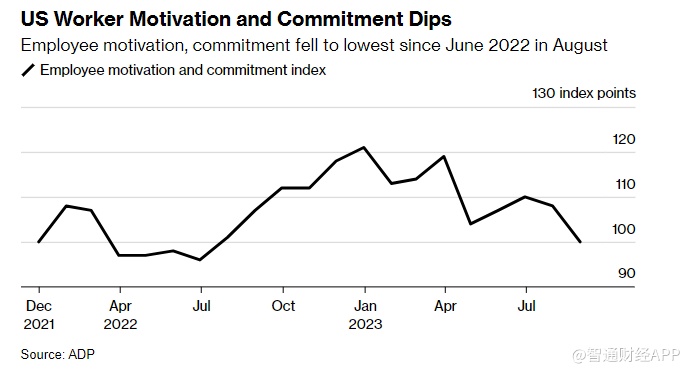 智通财经APP获悉,一项新的调查显示,今年美国员工的工作积极性在下降,大多数人对工作的投入程度不高,这降低了他们的工作效率。根据ADP研究所周三公布的月度员工积极性和敬业度指数,截至8月,该指数为100,是自去年6月以来的最低水平,远低于去年12月的最高值121。ADP表示,高于100的数值表明员工的积极性和敬业度在提高,而低于100的数值则表明积极性在下降。
