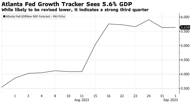 智通财经获悉,美国经济目前最近看起来非常稳健,以至于美联储官员在本月晚些时候发布最新经济展望时,可能需要将美国2023年的经济增长预测上调一倍。在从消费者支出到住宅投资等一系列数据强于预期之后,经济学家一直在调高对美国国内生产总值(GDP)的预期。亚特兰大联储发布的一项受到广泛关注的非官方估计甚至认为,美国第三季度折合成年率将增长5.6%。