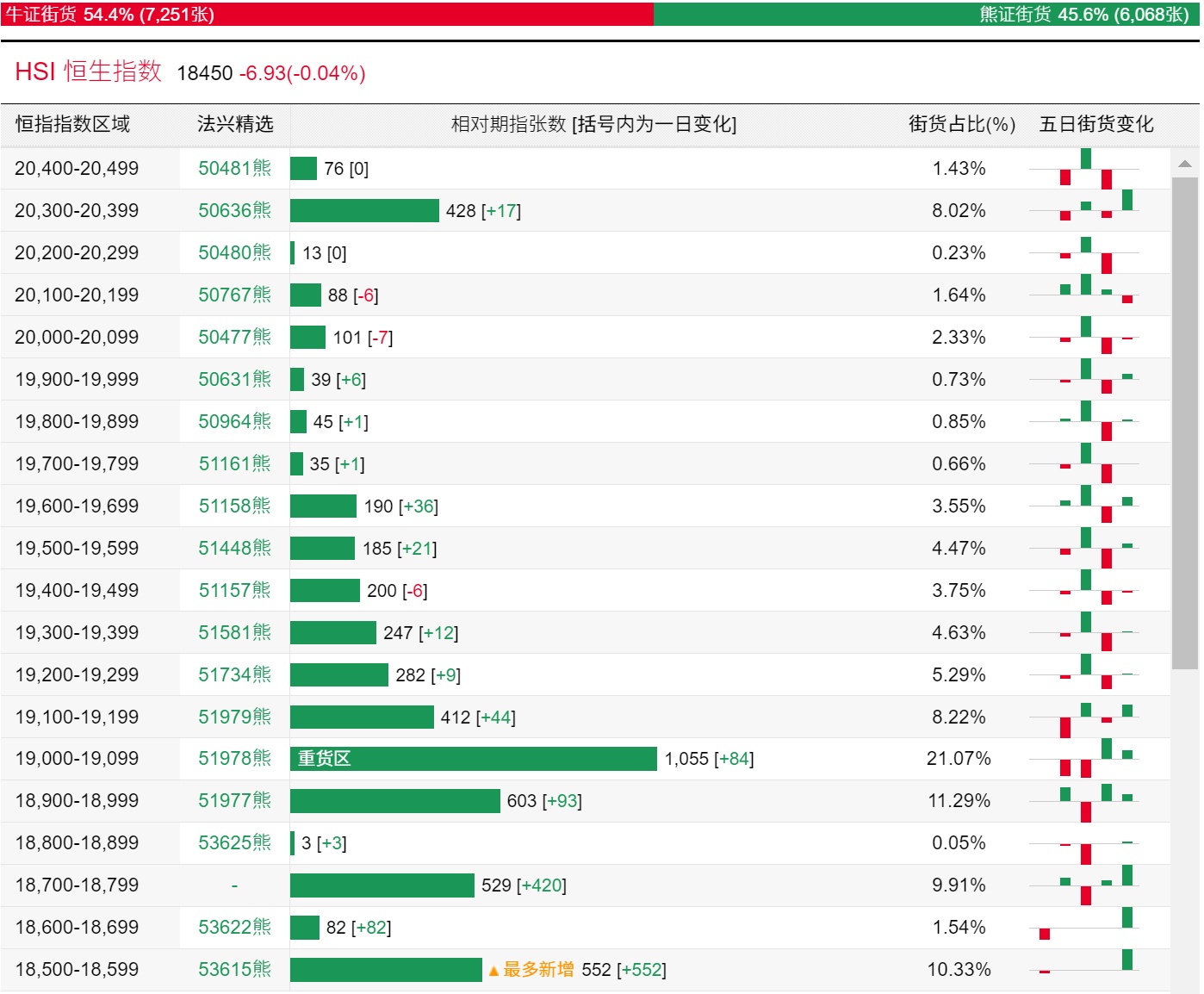 法兴恒指牛熊证街货分布图中的数据显示,熊证街货重货区在19000-19099区间,该区间最新熊证数量为1055张,较上一交易日增加84张;最多新增在18500-18599区间,该区间最新熊证数量为552张,较上一交易日增加552张。