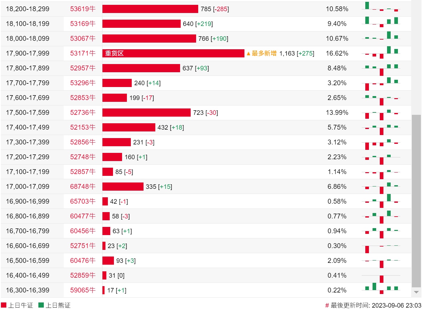牛证街货重货区和最多新增都在17900-17999区间,该区间最新牛证数量为1163张,较上一交易日增加275张。
