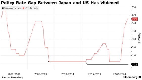 由于日本央行坚持鸽派立场,而其他央行纷纷加息,日元兑10国集团(十国集团)所有货币今年都走弱。自2016年以来,日本的政策利率一直为-0.1%,而美国的政策利率目前为5.5%。