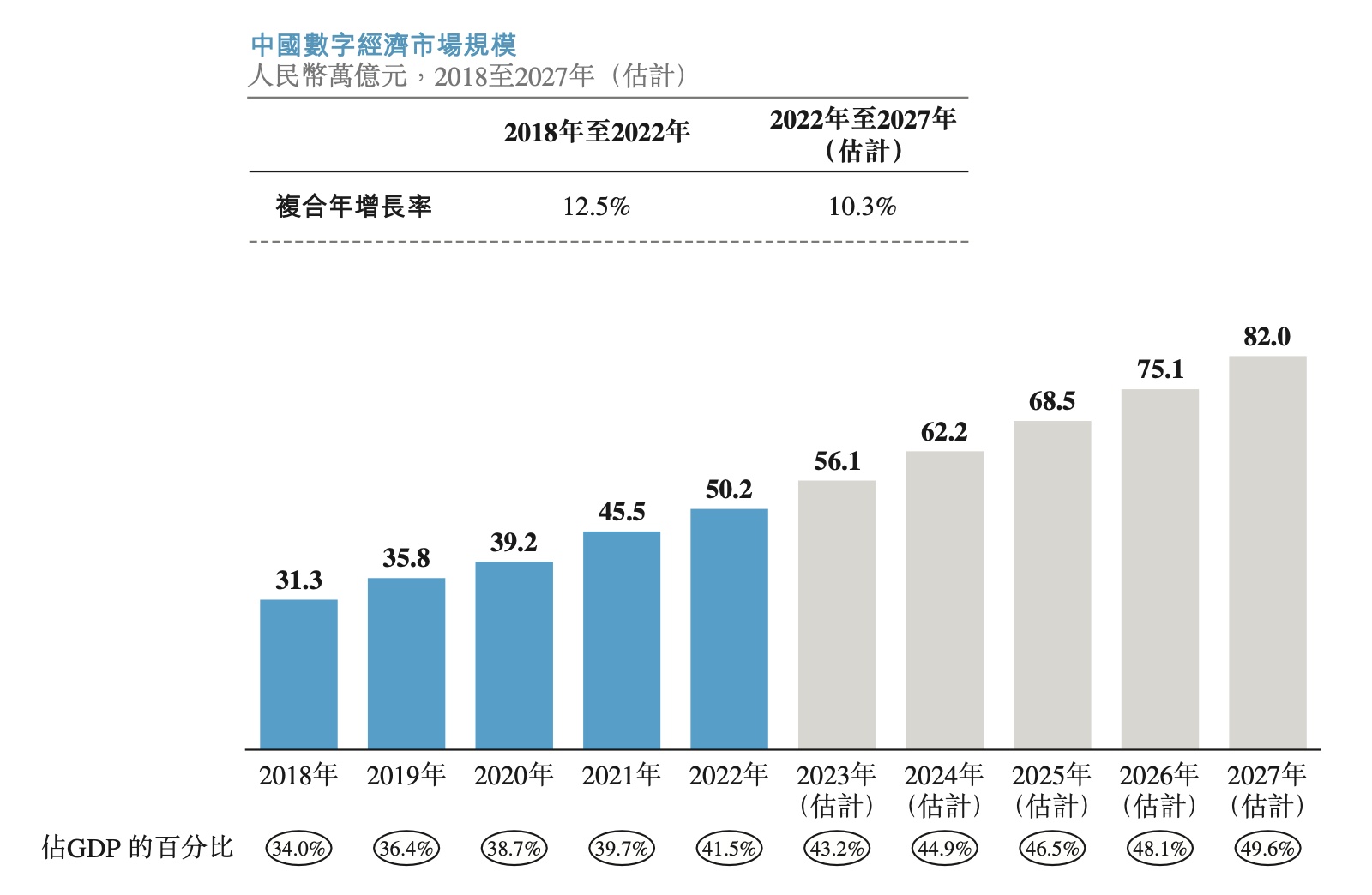 先从行业来看,智通财经APP了解到,在全国企业及个人的广泛参与下,近年来中国数字经济市场高速增长,于2022年规模达到50.2万亿元,约占GDP的41.5%,而2018年则约占GDP的34.0%,年复合增长率为12.5%,预计到2027年将达到82.0万亿元,期内复合年增长率为10.3%,占2027年中国预期GDP总额的约49.6%。