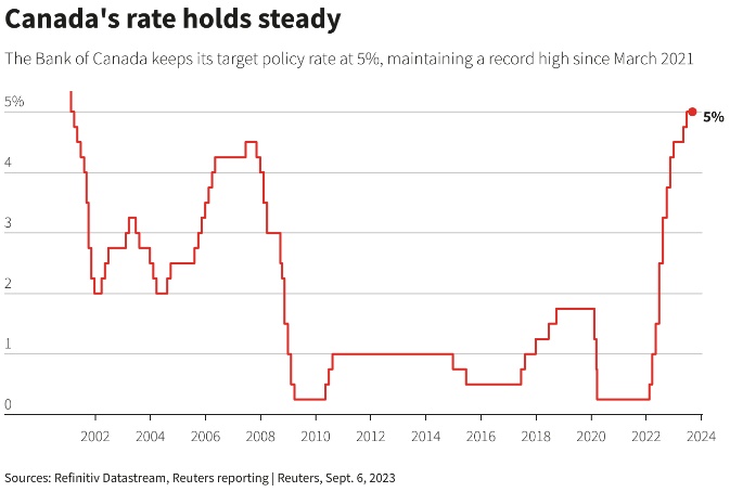 加拿大央行在一份声明中表示:“鉴于最近有证据表明,经济中的过度需求正在缓解,考虑到货币政策的滞后效应,加拿大央行管理委员会决定将政策利率维持在5%。”