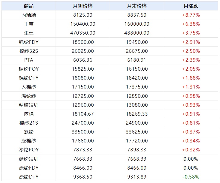 据生意社价格监测,2023年8月大宗商品价格涨跌榜中纺织板块环比上升的商品共16种,其中涨幅5%以上的商品共2种,占该板块被监测商品数的10.5%;涨幅前3的商品分别为丙烯腈(8.77%)、干茧(6.38%)、生丝(3.75%)。环比下降的商品仅1种,是涤纶DTY(-0.58%)。