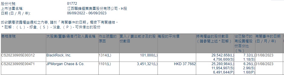 智通财经APP获悉,香港联交所最新资料显示,8月31日,小摩增持赣锋锂业(01772)345.1321万股,每股作价37.7662港元,总金额约为1.30亿港元。增持后最新持股数目约为2528.10万股,最新持股比例为6.26%。