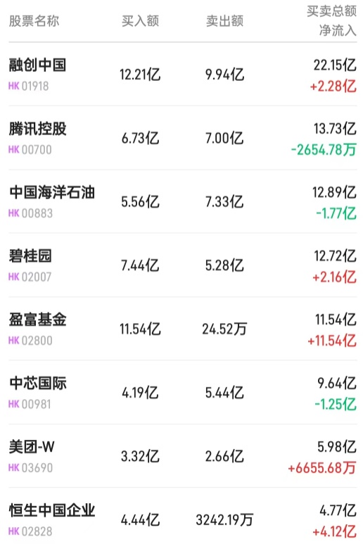 北水净买入最多的个股是盈富基金(02800)、恒生中国企业(02828)、融创中国(01918)。北水净卖出最多的个股是腾讯(00700)。