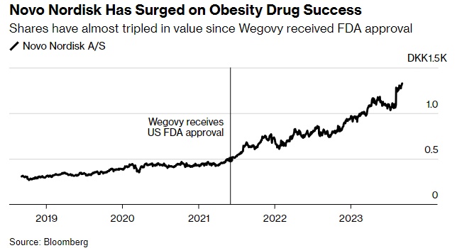 以Richard Vosser为首的摩根大通分析师表示,这家丹麦制药商将成为肥胖症和心血管疾病治疗方式转变的最大受益者。在其Ozempic和Wegovy注射药物取得成功后,诺和诺德目前已成为欧洲市值最高的公司。