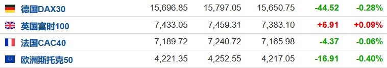 2.截至发稿,德国DAX指数跌0.28%,英国富时100指数涨0.09%,法国CAC40指数跌0.06%,欧洲斯托克50指数跌0.40%。