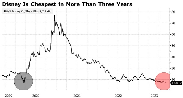 自2021年达到3670亿美元的峰值以来,迪士尼(DIS.US)的市值已经损失了约2180亿美元。目前,迪士尼基于未来12个月预期利润的市盈率为17倍,低于平均水平;这远低于2020年底77倍的峰值,当时低利率和对流媒体业务的热情推动该股飙升。尽管迪士尼的估值处于自新冠疫情以来最便宜的水平,但仍没有吸引投资者大举买入。