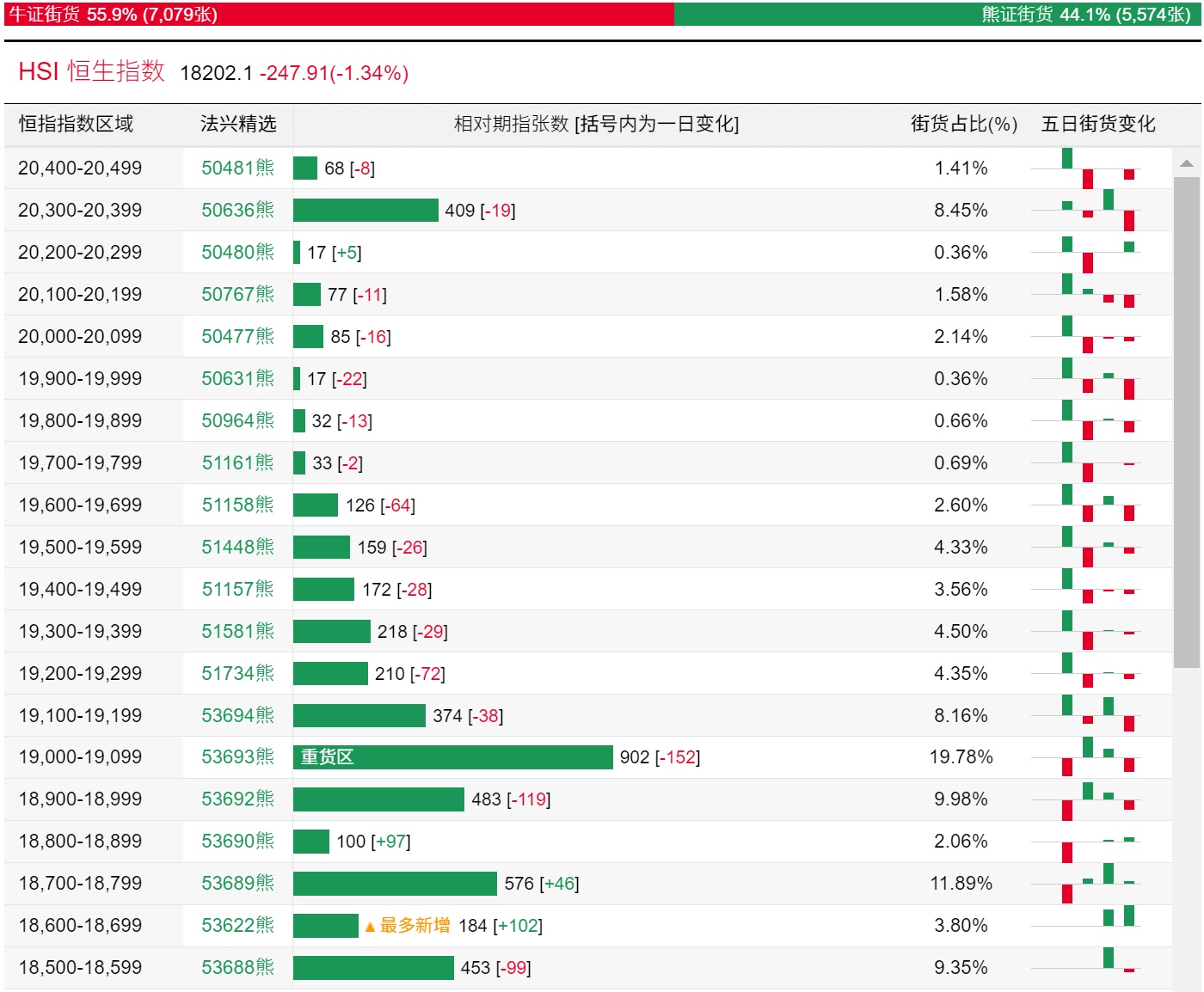 法兴恒指牛熊证街货分布图中的数据显示,熊证街货重货区在19000-19099区间,该区间最新熊证数量为902张,较上一交易日减少152张;最多新增在18600-18699区间,该区间最新熊证数量为184张,较上一交易日增加102张。