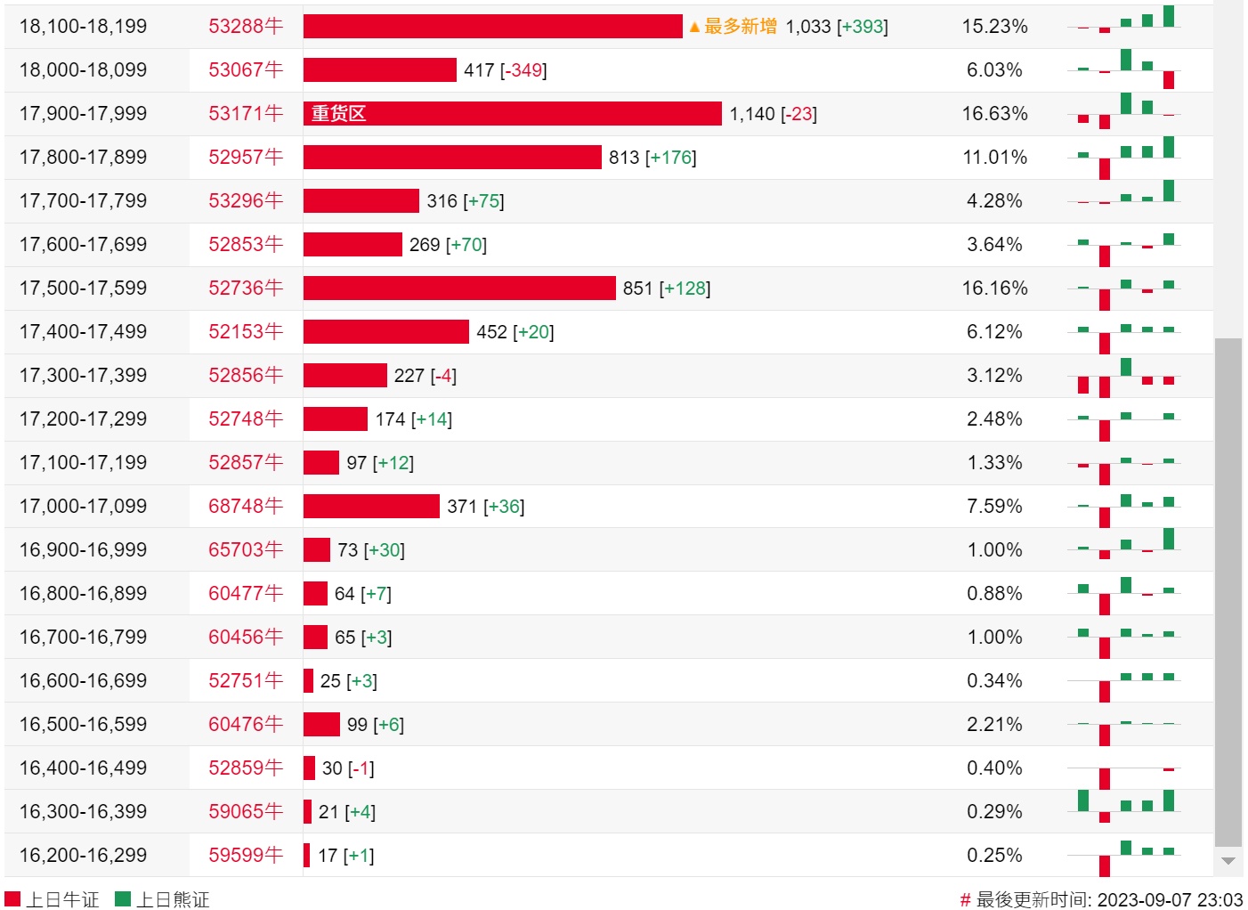 牛证街货重货区在17900-17999区间,该区间最新牛证数量为1140张,较上一交易日减少23张;最多新增在18100-18199区间,该区间最新牛证数量为1033张,较上一交易日增加393张。