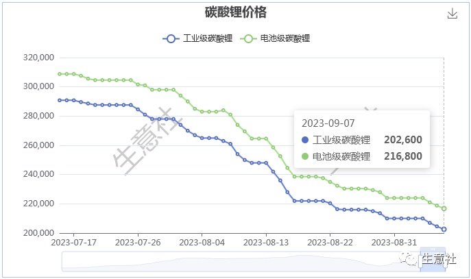 智通财经APP获悉,据生意社商品行情分析系统,本周工业级和电池级碳酸锂价格仍保持下跌走势。9月7日工业级碳酸锂国内混合均价为202600元/吨,与9月3日均价210000元/吨相比下降了3.52%;电池级碳酸锂国内混合均价为216800元/吨,与9月3日均价224000元/吨相比下降了3.21%。