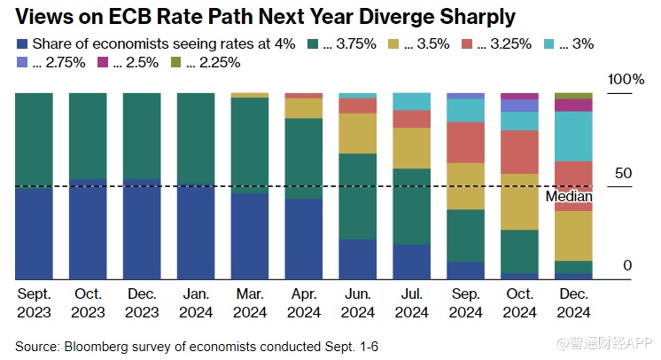 智通财经APP获悉,经济学家们认为欧洲央行将最后一次加息以抑制通胀,但他们不确定这是否会在下周发生。Bloomberg调查显示,约一半受访者预计欧洲央行下周四将连续第10次加息,而另一半受访者预计欧洲央行在10月存款利率达到创纪录的4%之前会“鹰派暂停加息”。