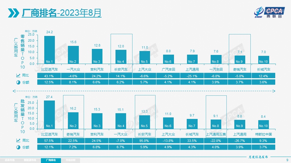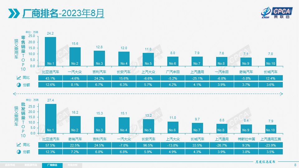 4)车企:8月新能源乘用车企业总体走势较强,比亚迪纯电动与插混双驱动夯实自主品牌新能源领先地位;以长安、上汽、广汽、吉利等为代表的传统车企在新能源板块表现尤为顽强。在产品投放方面,随着自主车企在新能源路线上的多线并举,市场基盘持续扩大,厂商批发销量突破万辆的企业达到15家(同、环比均持平),占新能源乘用车总量87%(上月88.1%,去年同期82%)。其中:比亚迪汽车274,086辆、特斯拉中国84,159辆、吉利汽车47,299辆、广汽埃安45,029辆、长安汽车36,919辆、上汽通用五菱35,612辆、理想汽车34,914辆、上汽乘用车26,615辆、长城汽车26,266辆、蔚来汽车19,329辆、零跑汽车14,190辆、小鹏汽车13,988辆、上汽大众13,003辆、哪吒汽车12,103辆、奇瑞汽车10,579辆。