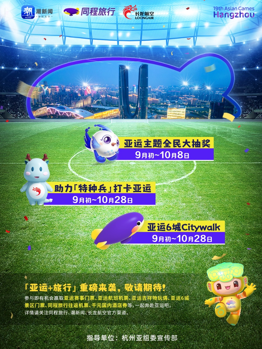 其中,亚运全民大抽奖以潮新闻客户端为唯一抽奖入口,由同程旅行、长龙航空作为“首席福利官”提供机票、火车票、亚运周边等文旅奖品,从9月8日持续至10月8日,参与用户每日最多有三次抽奖机会;助力“特种兵”打卡亚运城市活动由三方分别发起,将结合亚运会赛程上线打卡亚运场馆、打卡长龙航空“亚运号”彩绘飞机、打卡亚运六城景区等不同任务。亚运六城Citywalk线下集章则由三方共同发布覆盖杭州、宁波、温州、金华、绍兴、湖州6个亚运城市的多条亚运主题Citywalk推荐路线,并在六个办赛城市的近50家景区设置线下打卡“集章点”。用户在沉浸式体验新潮旅行方式的同时,将有机会获得亚运航班单程机票、亚运会/亚残运会赛事门票、免费往返机票、1000元国内酒店券等大奖。