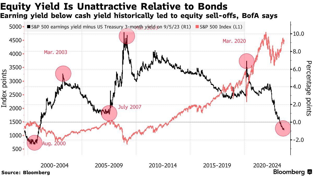 债券收益率的上升令股票也失去了吸引力。数据显示,标普500指数的收益率约为4.6%,低于三个月期美债5.5%的收益率,两者的差距为-0.9个百分点,是2000年以来的最低水平。