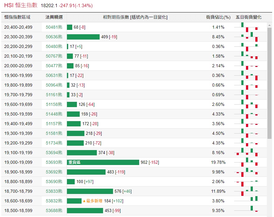 法兴恒指牛熊证街货分布图中的数据显示,熊证街货重货区在19000-19099区间,该区间最新熊证数量为902张,较上一交易日减少152张;最多新增在18600-18699区间,该区间最新熊证数量为184张,较上一交易日增加102张。