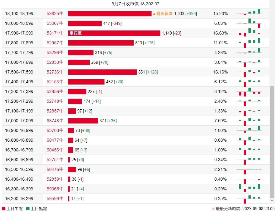牛证街货重货区在17900-17999区间,该区间最新牛证数量为1140张,较上一交易日减少23张;最多新增在18100-18199区间,该区间最新牛证数量为1033张,较上一交易日增加393张。
