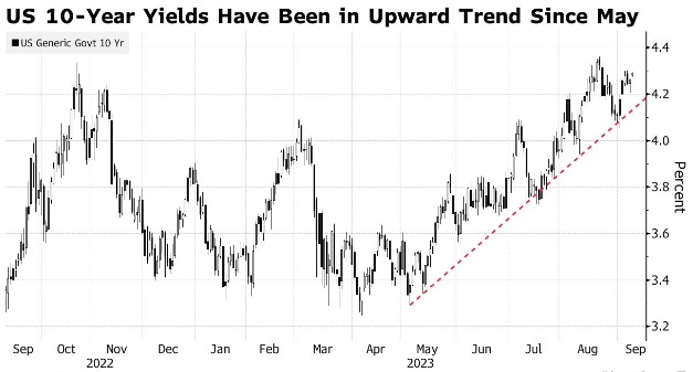 基准美国国债收益率已从4月份创下的今年低点攀升约1个百分点。由于经济数据好于预期,交易员放弃了对美联储今年降息的押注。美国财政部长珍妮特·耶伦周日表示,她对美国避免经济衰退和遏制通货膨胀“感觉非常好”,截至发稿,10年期美国国债收益率周一又上升了3个基点,达到4.29%。