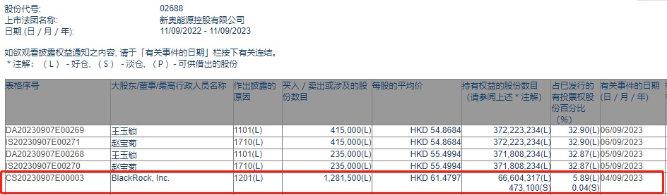智通财经APP获悉,香港联交所最新资料显示,9月4日,贝莱德减持新奥能源(02688)128.15万股,每股作价61.4797港元,总金额约为7878.62万港元。减持后最新持股数目约为6660.43万股,最新持股比例为5.89%。