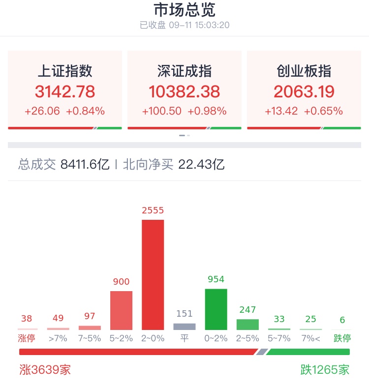 总体来看,两市个股涨多跌少,上涨个股超3700只,两市全天成交8412亿元,较上一日放量成交1594亿元,北向资金全天净流入22.44亿元。