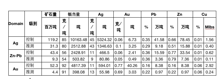 资源量估算报告将科兰加银金矿矿床分为三个矿化区域:银矿化区、锌铅矿化区和金矿化区。资源量估算报告还考虑了科兰加项目的矿权范围和露天采矿境界的限制,采用的边界品位为银当量40克/吨(“g/t”)。