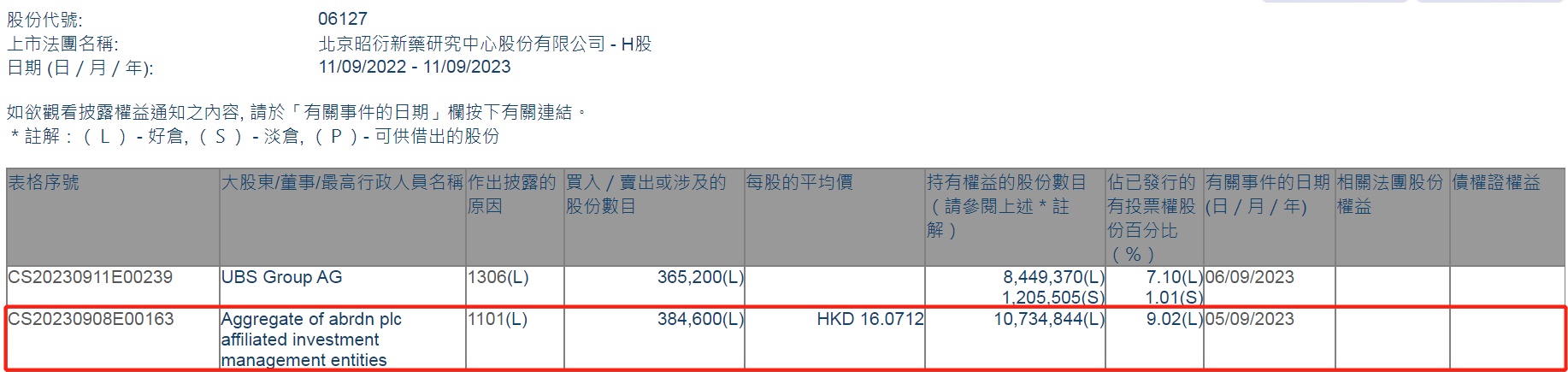 智通财经APP获悉,香港联交所最新资料显示,9月5日,Aggregate of abrdn plc affiliated investment management entities增持昭衍新药(06127)38.46万股,每股作价16.0712港元,总金额约为618.1万港元。增持后最新持股数目约为1073.48万股,最新持股比例为9.02%。