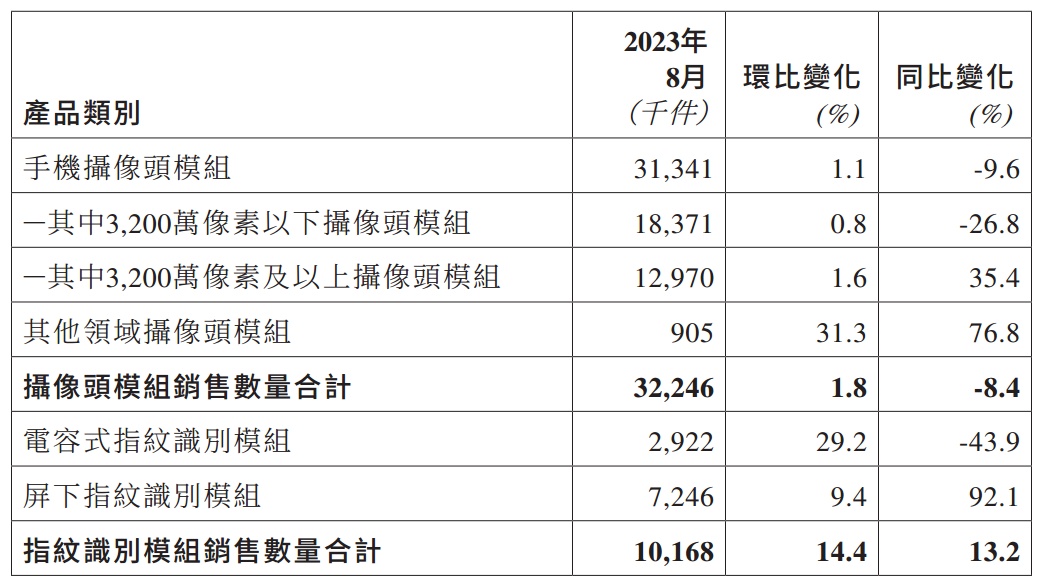 公告称,摄像头模组产品销售数量环比增加,主要是由于客户项目周期因素,及集团与主要客户于中高端产品上的合作继续深入;同比减少主要是由于集团于摄像头模组业务上面聚焦中高端产品,减少低端产品的承揽与出货。其他领域摄像头模组销售数量环比及同比上升,主要由于集团于智能汽车和物联网(IoT)领域的摄像头模组业务继续取得良好进展。