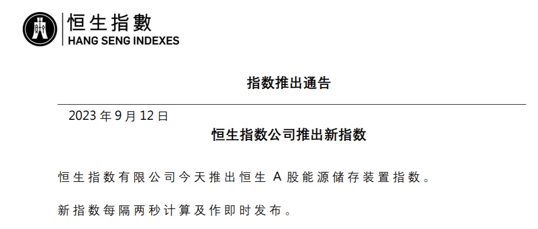 智通财经APP获悉,9月12日,恒生指数有限公司推出恒生A股能源储存装置指数,成份股数目为40只,新指数每隔两秒计算及作即时发布。该指数旨在反映与能源储存装置业务相关,并于内地上市之A股公司的表现,选股范畴主要为恒生A股(可投资)指数(“HSCAII”)的成份股。
