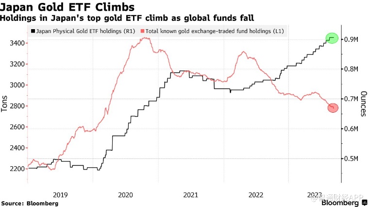 自疫情颠覆世界经济以来,日本投资者也对黄金支持的交易所交易基金(ETF)表现出浓厚兴趣,其持有量从2020年开始强劲增长。这与全球总体情况形成了鲜明对比,由于投资者担心美联储将在更长时间内维持高利率以抑制顽固的通胀,因此继续回避黄金,全球持有的黄金总量出现了大幅流出。较高的借贷成本对不产生利息的黄金来说通常是负面的。