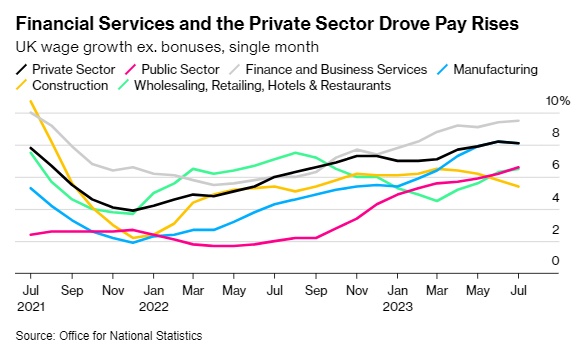 英国央行正在密切关注的私营部门工资出现了拐点的初步迹象。数据显示,私营部门的工资增速从8.2%降至8.1%,略有放缓。