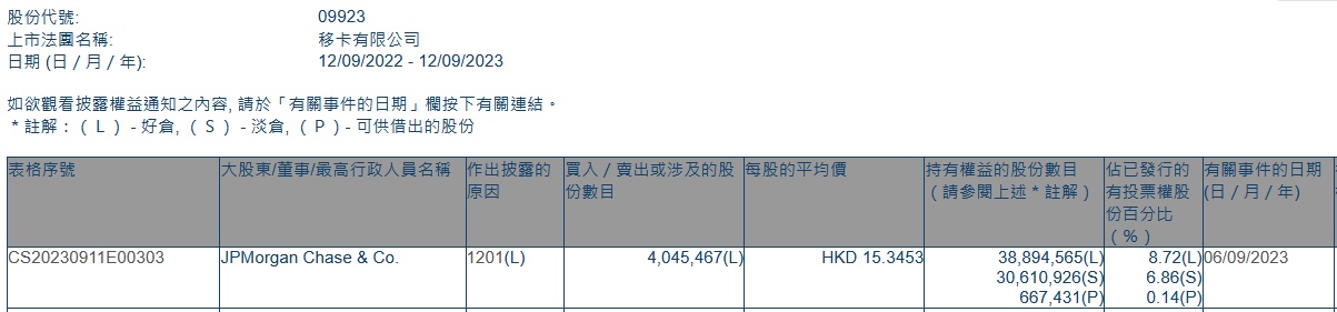智通财经APP获悉,香港联交所最新资料显示,9月6日,小摩减持移卡(09923)404.5467万股,每股作价15.3453港元,总金额约为6207.89万港元。减持后最新持股数目约为3889.46万股,最新持股比例为8.72%。