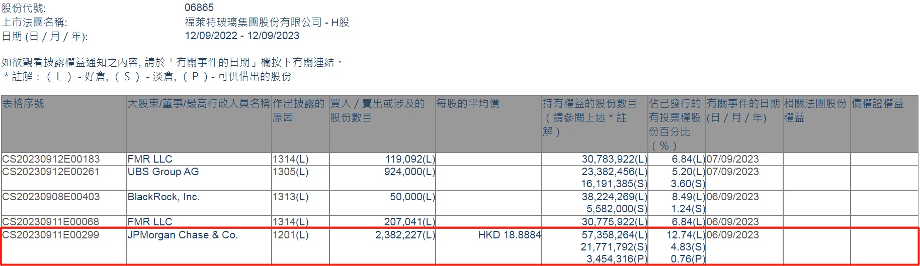智通财经APP获悉,香港联交所最新资料显示,9月6日,小摩减持福莱特玻璃(06865)238.2227万股,每股作价18.8884港元,总金额约为4499.65万港元。减持后最新持股数目约为5735.83万股,最新持股比例为12.74%。