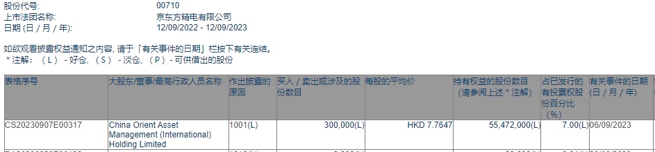 智通财经APP获悉,香港联交所最新资料显示,9月6日,China Orient Asset Management (International)Holding Limited增持京东方精电(00710)30万股,每股作价7.7647港元,总金额约为232.94万港元。增持后最新持股数目为5547.2万股,最新持股比例为7%。