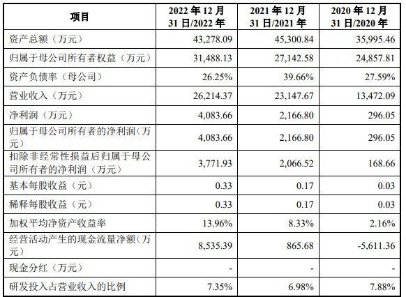 财务方面,于2020年度、2021年度、2022年度,公司实现营业收入分别约为1.35亿元、2.31亿元、2.62亿元;实现净利润分别为296.05万元、2166.8万元、4083.66万元。