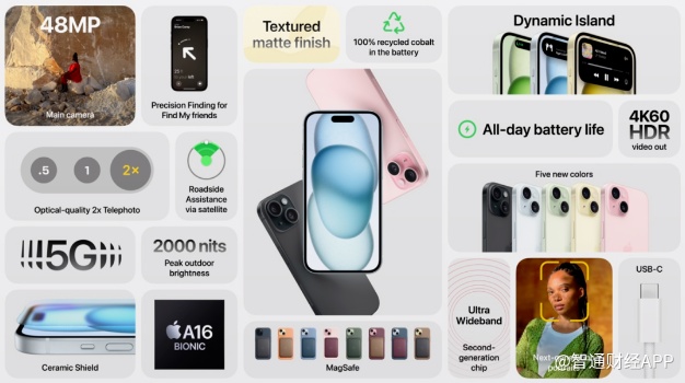 智通财经APP获悉,美东时间9月12日周二,苹果(AAPL.US)今年最重磅的新品发布会开幕,官宣最新iPhone15家族、Apple Watch Series 9、Apple Watch Ultra 2。最重磅的改革是充电口变Type-C,现在可以用一根充电线给iphone、ipad和电脑充电,甚至可以直接用iPhone给Air Pods充电。