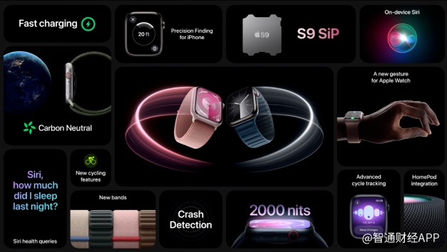 第9代Apple Watch比8代多60%线程处理。同时,新一代苹果手表扩大了电池容量,可以达到全天18小时续航!并且,最新一代更新了芯片,增加了全新功能:戴手表的那只手,只要捏动拇指和食指,即可实现接电话、计时等操作,相比前作让用户更加便捷操作了。