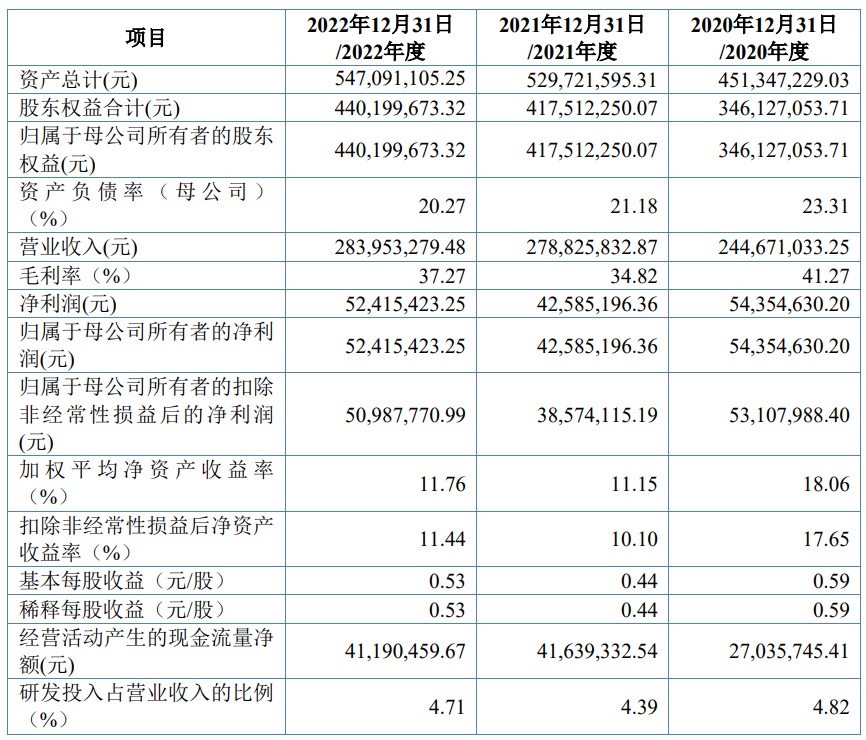 财务方面,于2020年度、2021年度及2022年度,公司实现营业收入分别约为2.45亿元、2.79亿元、2.84亿元。公司净利润分别约为5435.46万元、4258.52万元、5241.54万元人民币。