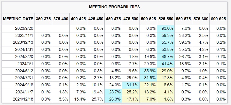投资和私人财富管理公司Glenmede的Jason Pride和Michael Reynolds表示,如果本周的通胀数据低于这些预期,这可能向交易员发出信号,表明美联储已经触及利率峰值,不会进一步加息。但如果通胀强于预期,今年晚些时候可能会有更多的加息,导致市场更加优柔寡断和波动。根据CME的Fed watch工具,金融市场认为美联储官员在9月19日至20日的政策会议上暂停加息的可能性超过90%,但认为11月再次暂停加息的可能性较低,约为59%。